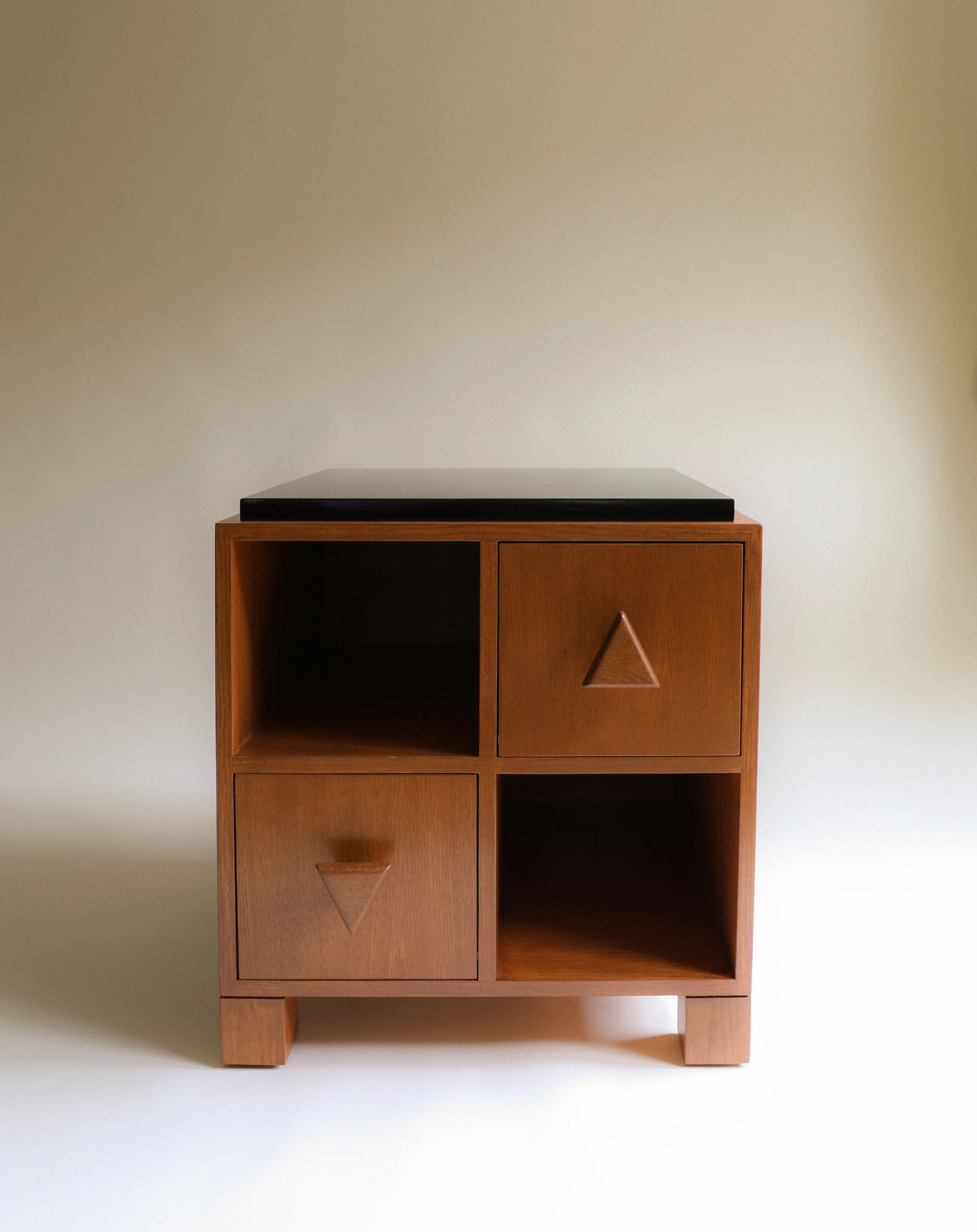 The Felix Nightstand reinterprets Amsterdam School principles through a contemporary lens—graphic, grounded, and quietly playful. Crafted in solid wood with a hand- polished black lacquer top, its stepped profile and clean lines strike a balance between austerity and irreverence. There two options: Left and Right Facing.