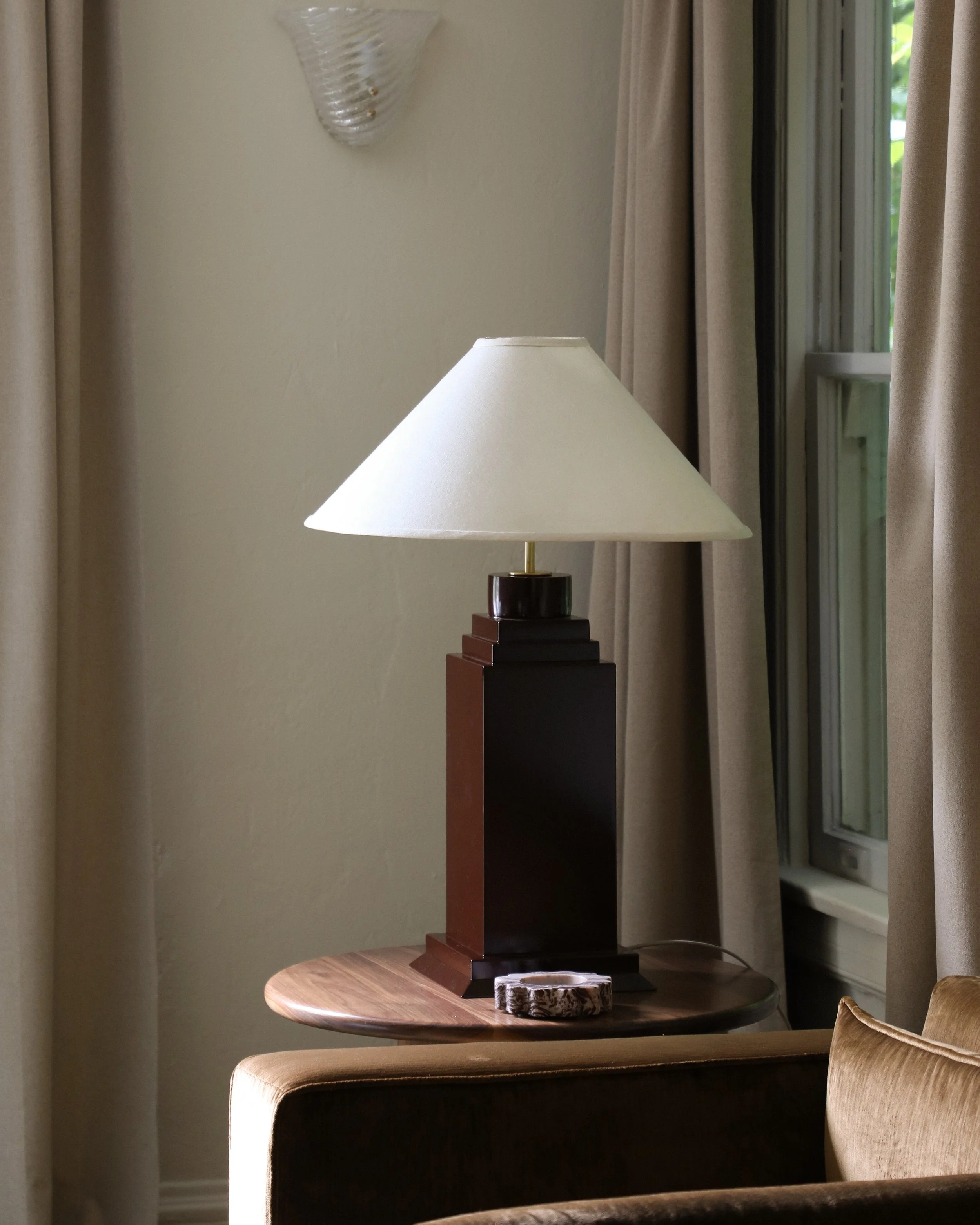 Featuring a stepped silhouette, the Hudson Lamp draws inspiration from early modernist architecture and the quiet strength of sculptural form. Finished in four meticulous layers of hand-applied lacquer, its faceted oak base is grounded in rich materiality, contrasted by unlacquered brass hardware that will patina over time. A classic empire shade in natural linen completes the piece with a softened glow.